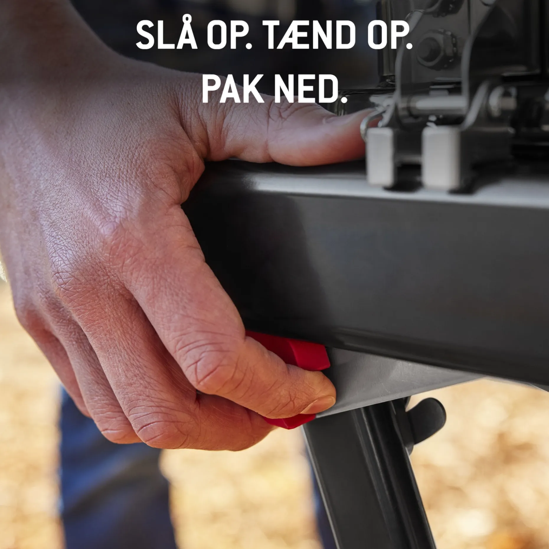 Grillens robuste design og automatiske låglås gør det enkelt og sikkert at tage grillen med overalt, lige fra skoven til stranden. Løft grillen med én hånd, og sæt gang i grillen — der er plads til et måltid til 4 personer.