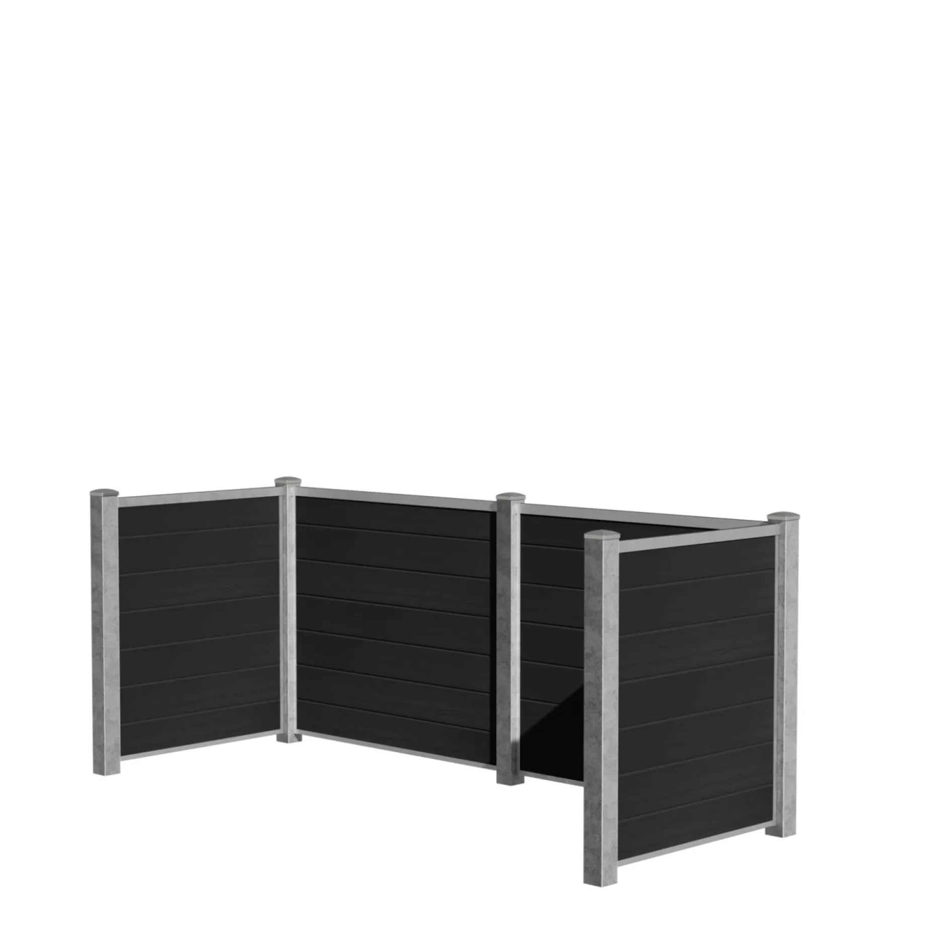 Renovationsskjul til 3 spande fra Wimex med kompositbrædder i Livø Prime matsort og galvaniserede stolper. Skjultet er designet til at holde affaldsbeholdere samlet og give et præsentabelt udtryk ved skel eller i haven.