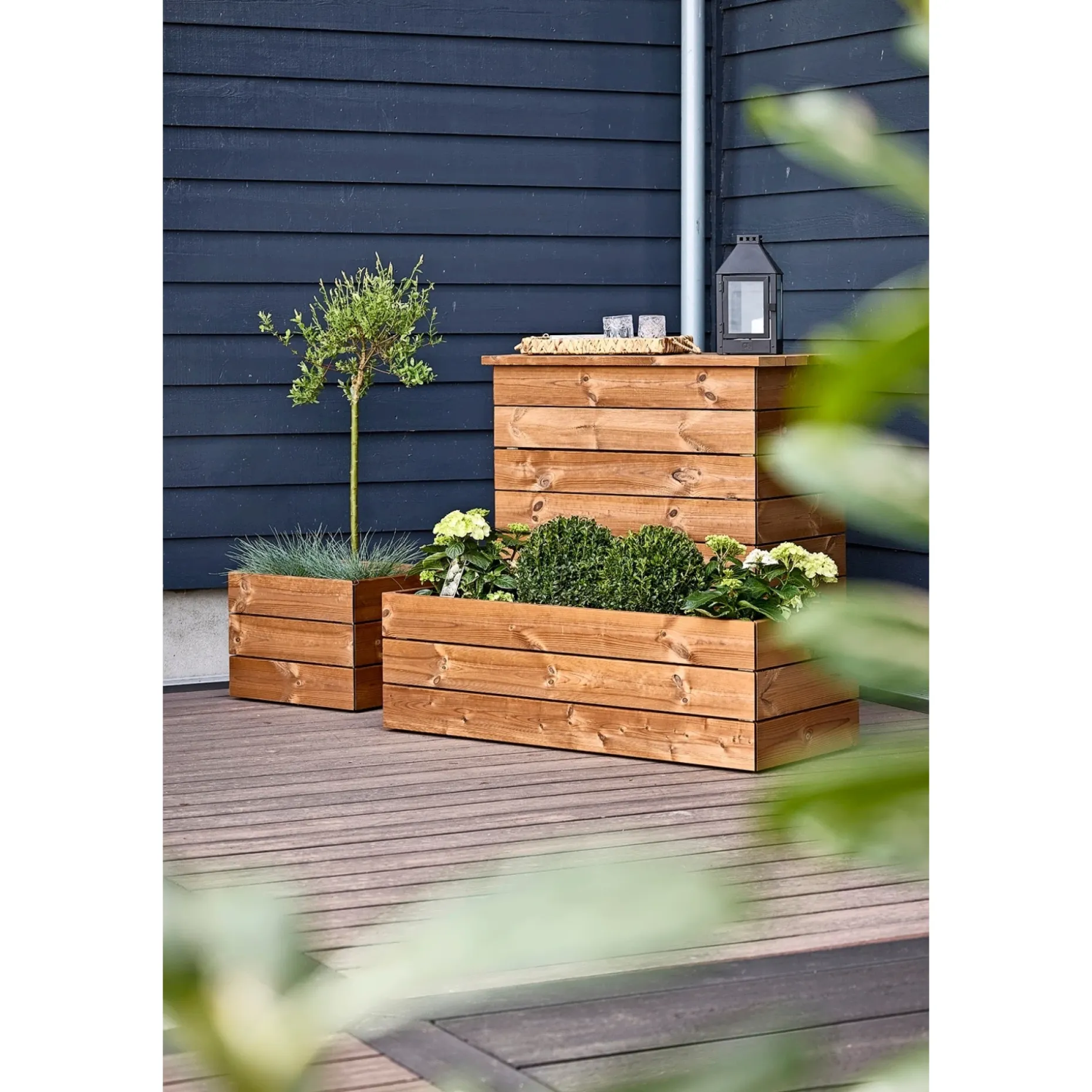Du kan sammensætte plantekasserne i forskellige højder og størrelser for at skabe dynamiske rum og variation i udtrykket. Placer en bænk mellem to plantekasser for et afgrænset opholdssted.