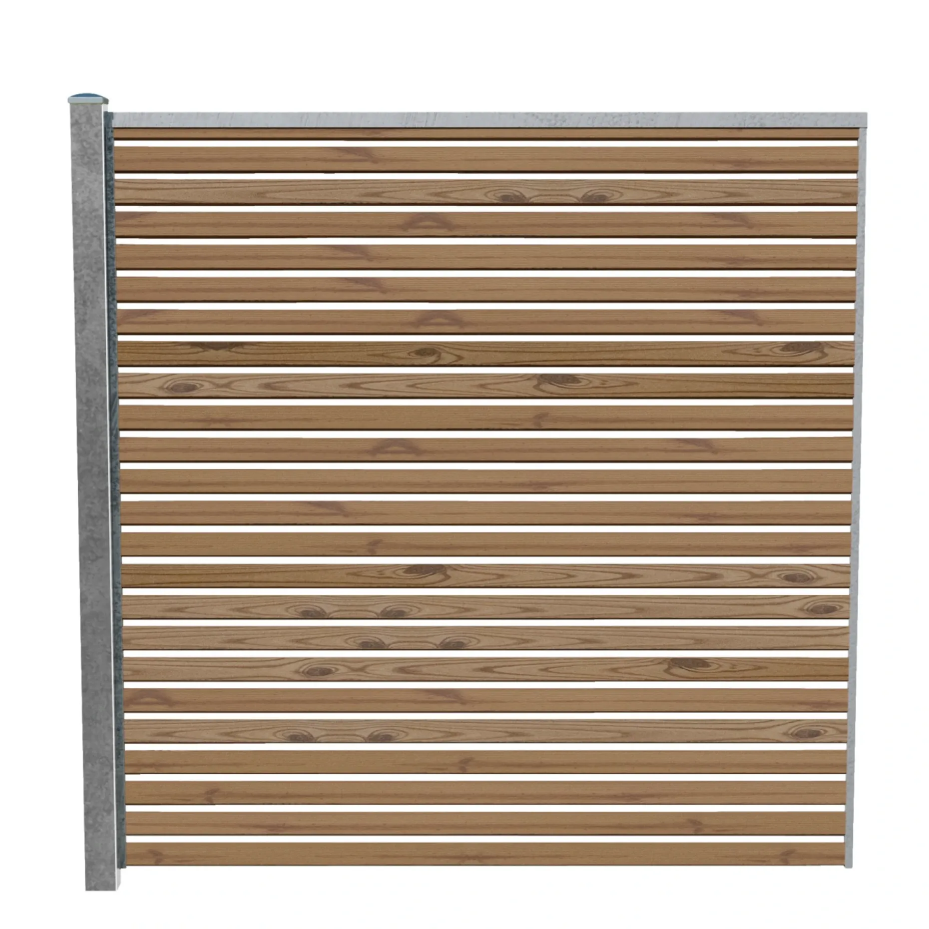 Hegnet leveres komplet med varmgalvaniserede stålstolper og montageskinner, hvilket gør monteringen enkel og sikrer et flot indrammet udtryk.