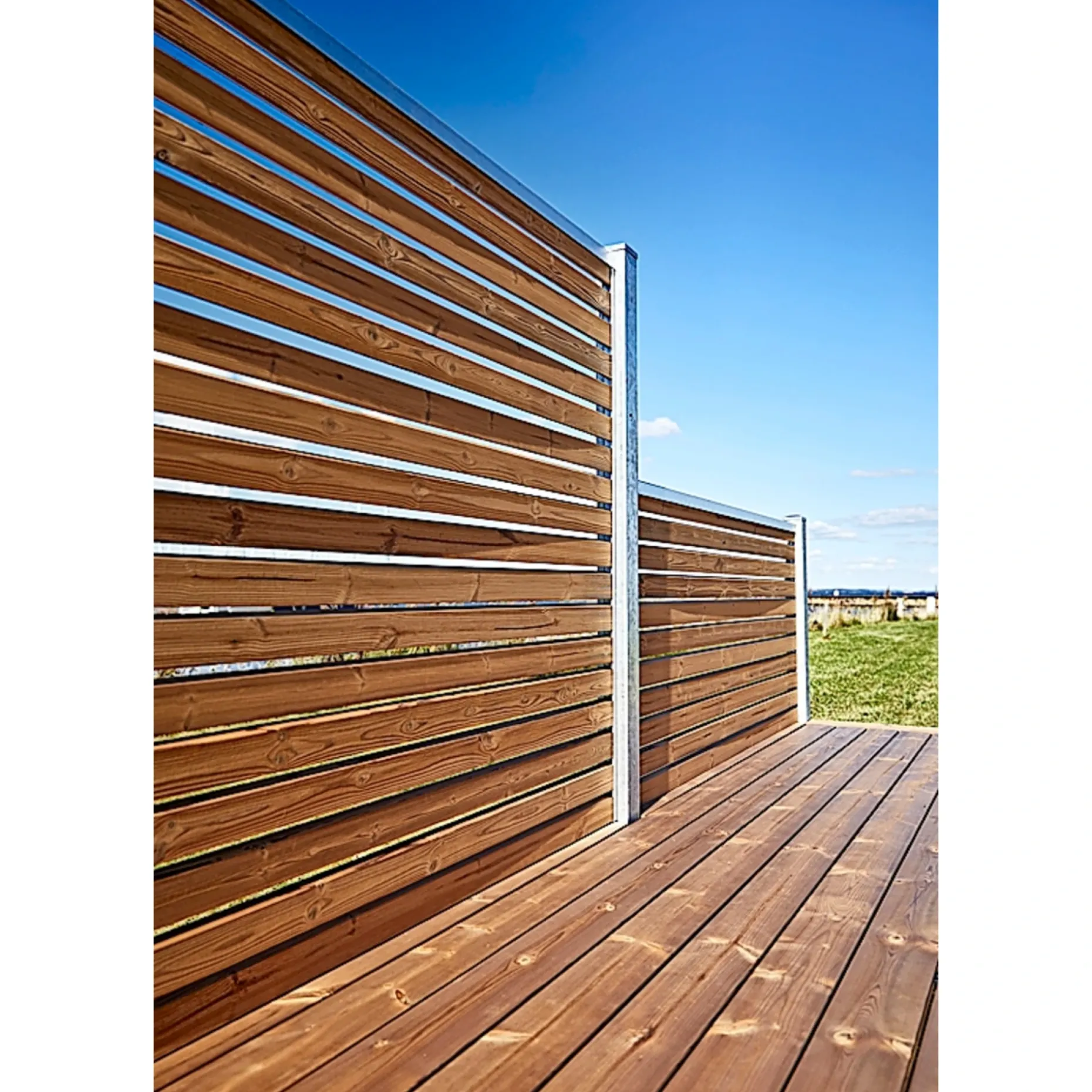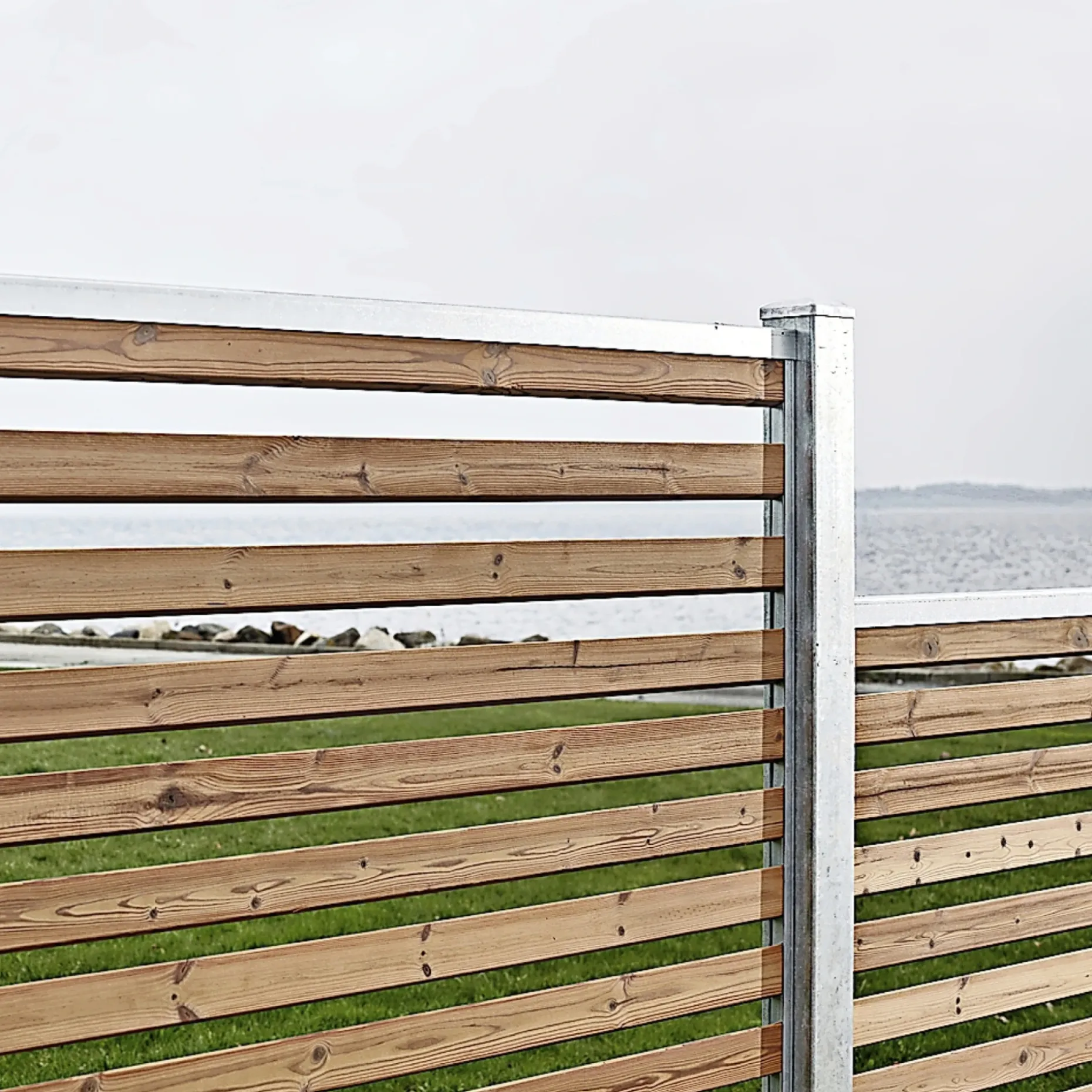 Hegnet leveres med varmgalvaniserede stålstolper og montageskinner, der indrammer brædderne og gør monteringen enkel og robust.